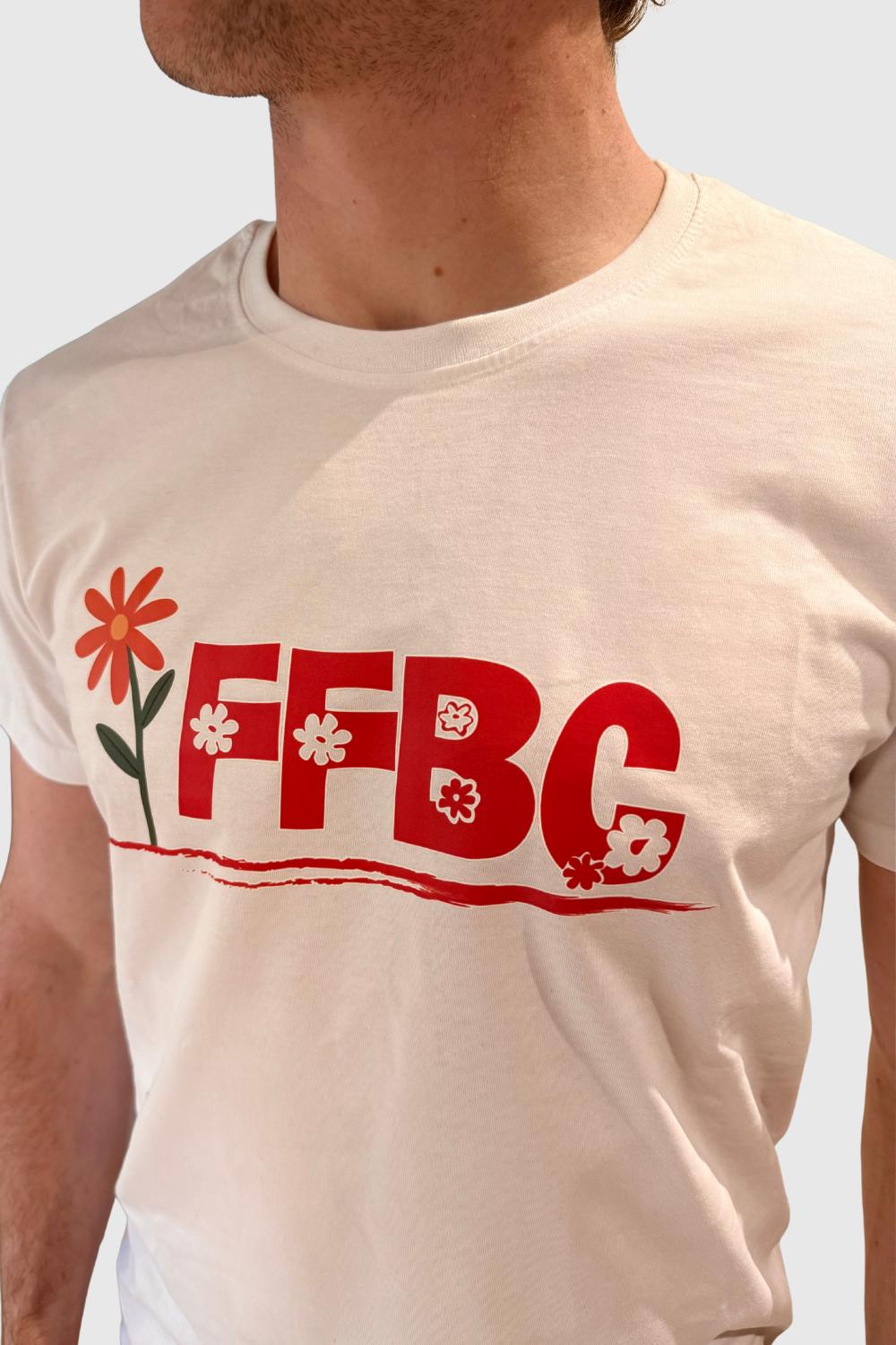 Tee-shirt blanc en coton doux et agréable à porter, décoré du logo FFBC Fleur rouge sur l’avant.