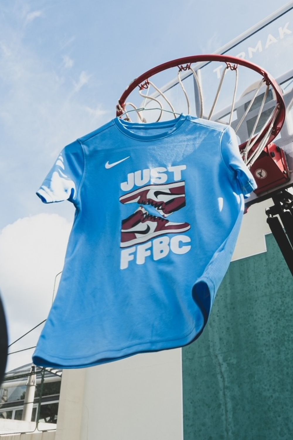 • Design exclusif Nike x FFBC : bleu ciel profond, marquage blanc “JUST FFBC” et  une Jordan 1, finition premium